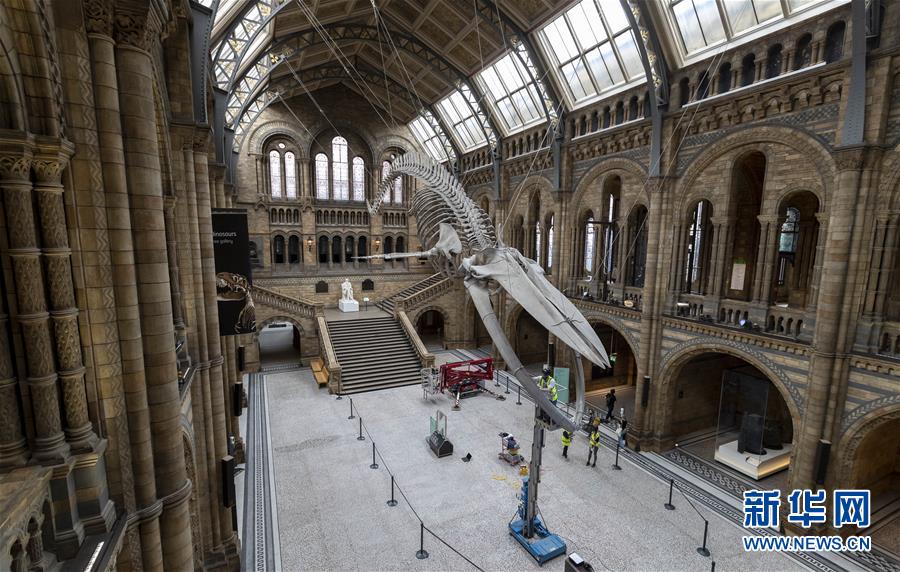 7月27日,工作人員在英國倫敦的自然歷史博物館大廳內(nèi)清潔一具藍鯨骨架。受新冠疫情影響關(guān)閉數(shù)月的英國自然歷史博物館將于8月5日重新對外開放,目前館方正在為重新開放做最后準備。參觀者需要提前預(yù)約參觀時段、全程佩戴口罩且保持安全距離。新華社記者韓巖攝