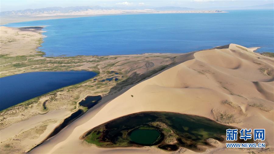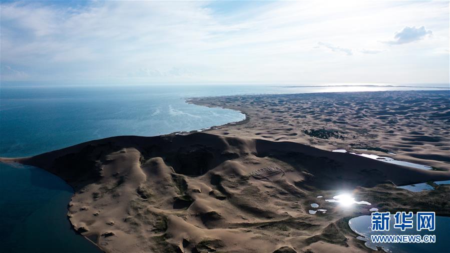 這是青海湖沙島風光(7月28日攝,無人機照片)。盛夏傍晚,位于青海湖東北部的沙島,島內(nèi)湖泊星羅棋布,沙丘連綿起伏,風景別致。金沙與湖水掩映,在陽光的勾勒下形成一幅美麗的畫卷。新華社記者張宏祥攝