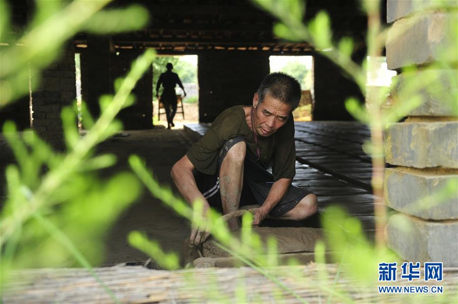 7月30日,河北省任丘市出岸鎮(zhèn)古建磚廠工人在制作磚坯。新華社記者牟宇攝
