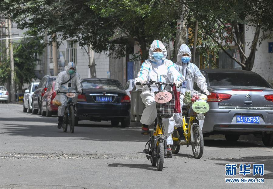 8月3日,在烏魯木齊天山區(qū)西河壩前街社區(qū),社區(qū)工作人員騎著”跑腿小車“為居民送去生活物品。新疆烏魯木齊市天山區(qū)西河壩前街社區(qū)主次干道較多,院落分布分散。新冠肺炎疫情防控期間,社區(qū)整合現(xiàn)有資源,將暫時(shí)閑置的自行車、電動(dòng)車集中起來,貼上“跑腿小車”標(biāo)識(shí),成立便民服務(wù)隊(duì),社區(qū)工作人員通過“跑腿小車”可將居民網(wǎng)絡(luò)定制的“菜袋子”“藥盒子”快速送達(dá),給居民帶來方便。新華社記者趙戈攝