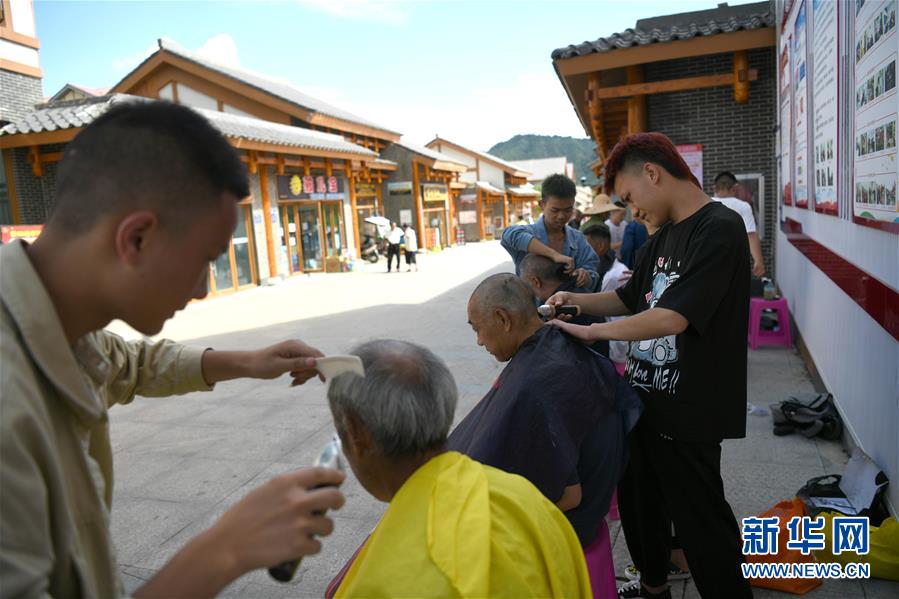 志愿者在柏楊林易地扶貧搬遷安置點(diǎn)為老人免費(fèi)理發(fā)(8月3日攝)。貴州省畢節(jié)市七星關(guān)區(qū)柏楊林易地扶貧搬遷安置點(diǎn)是畢節(jié)市最大的易地扶貧搬遷安置點(diǎn),總面積約1.1平方公里,從2017年開始至今,共有34個(gè)鄉(xiāng)鎮(zhèn)6372戶29001人安置到位。如今,安置點(diǎn)內(nèi)教育、醫(yī)療、就業(yè)扶貧車間、長幼日間托養(yǎng)照料中心等設(shè)施齊全,搬遷群眾在這里過上了安居樂業(yè)的幸福生活。新華社記者金良快攝