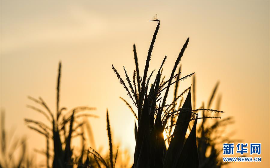 在吉林省梨樹縣國家百萬畝綠色食品原料(玉米)標準化生產(chǎn)基地核心示范區(qū),一只蜻蜓??吭谝恢暧衩咨希?月23日攝)。新華社記者許暢攝