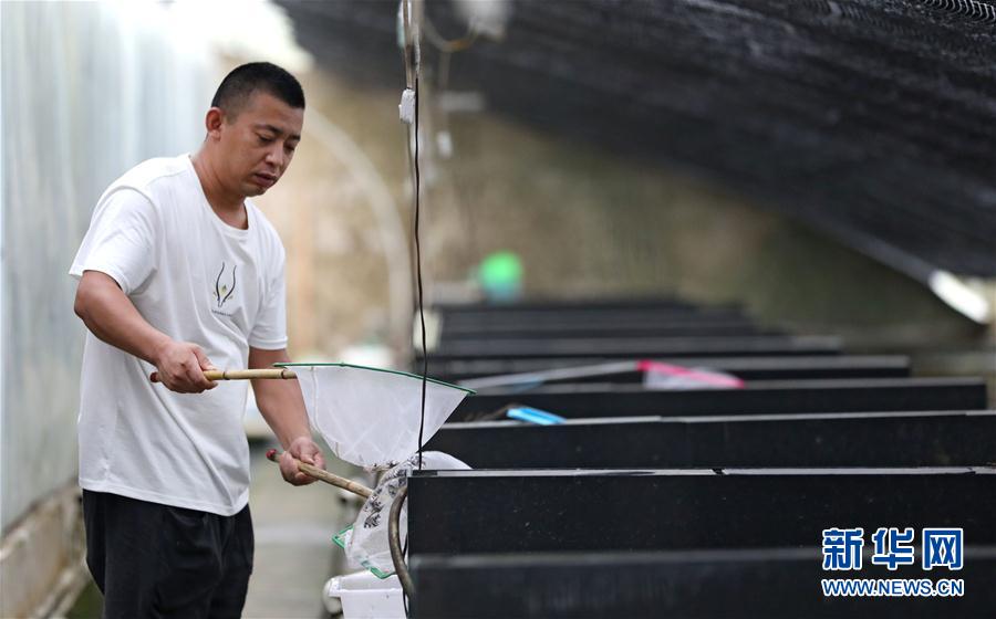8月4日,張忠堡村村民李國鵬在自家觀賞魚養(yǎng)殖池里撈魚。新華社記者姚劍鋒攝