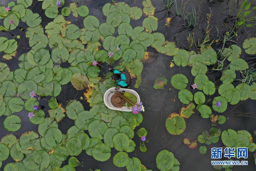 8月4日,藝溯家生態(tài)農(nóng)場工作人員在池塘采摘香水蓮花(無人機照片)。近年來,位于浙江湖州吳興區(qū)八里店鎮(zhèn)移沿山村的藝溯家生態(tài)農(nóng)場,在約45畝的傳統(tǒng)水產(chǎn)養(yǎng)殖池塘上規(guī)?;N植香水蓮花,既凈化水質(zhì),又提高了經(jīng)濟效益。農(nóng)場還設(shè)計出種植、采摘和加工香水蓮花的工藝流程,以面向更多農(nóng)戶推廣。新華社記者黃宗治攝