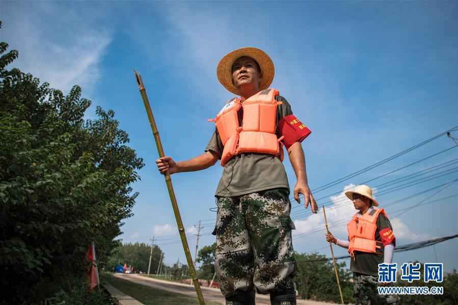 8月5日,夏德勤(左)與同事在長江武金堤上。新華社記者肖藝九攝