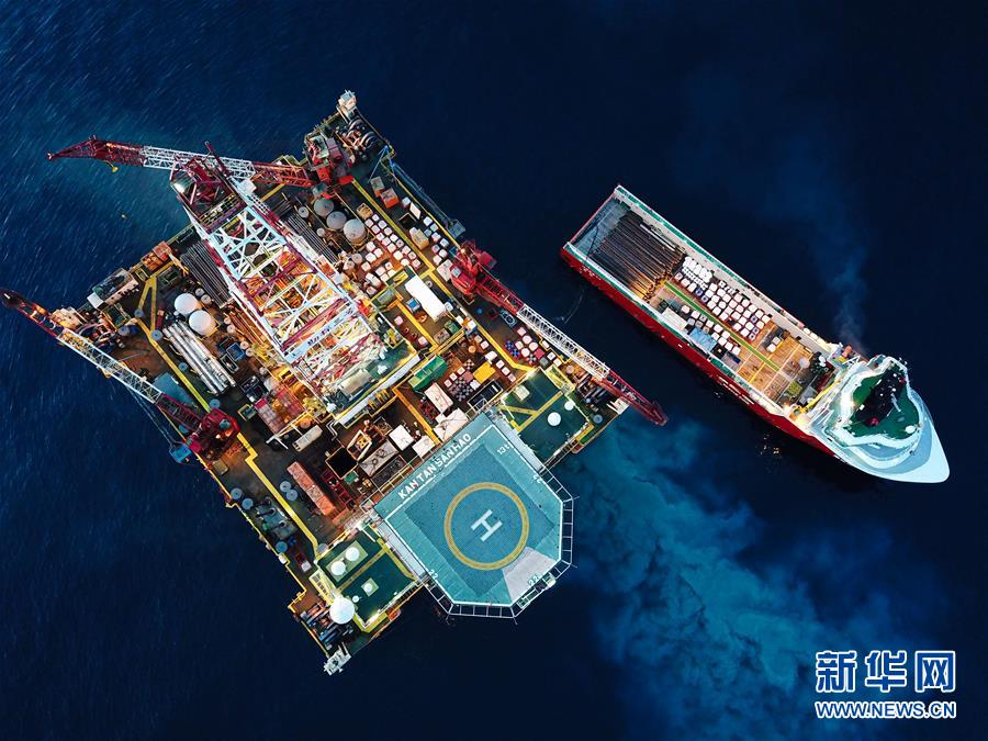 這是7月29日拍攝的正在南海北部海域進(jìn)行鉆探作業(yè)的勘探三號(hào)鉆井平臺(tái)和為其運(yùn)送物資的拖船(無(wú)人機(jī)照片)。新華社記者蒲曉旭攝