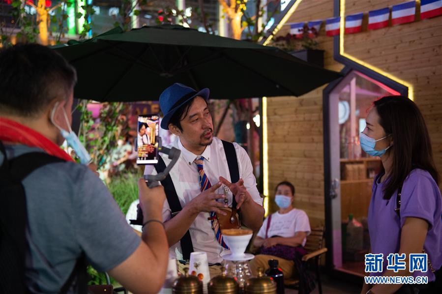 8月8日晚,望京小街商業(yè)街上一家咖啡店的工作人員(中)在接受網(wǎng)絡直播采訪。新華社記者 陳鐘昊 攝
