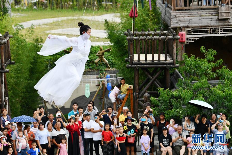 8月8日,游客在貴州省龍里縣“龍門鎮(zhèn)”武俠文化主題景區(qū)觀看武俠劇表演。近日,貴州省黔南布依族苗族自治州龍里縣境內(nèi)氣候宜人,龍里油畫大草原、“龍門鎮(zhèn)”武俠文化主題景區(qū)等景點(diǎn)吸引眾多游客前來觀光旅游。新華社記者楊文斌攝。