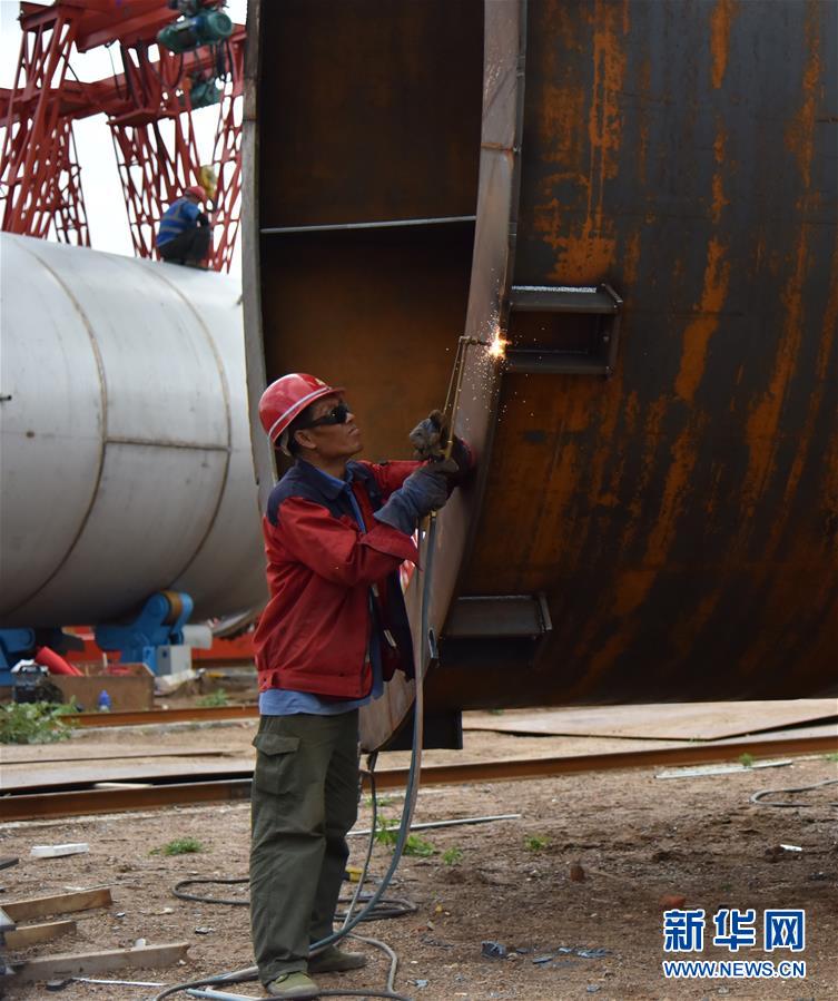在黑龍江省訥河市華瑞生物醫(yī)藥項目焊接現(xiàn)場,工人在焊接發(fā)酵罐(8月4日攝)。新華社記者梁冬攝。