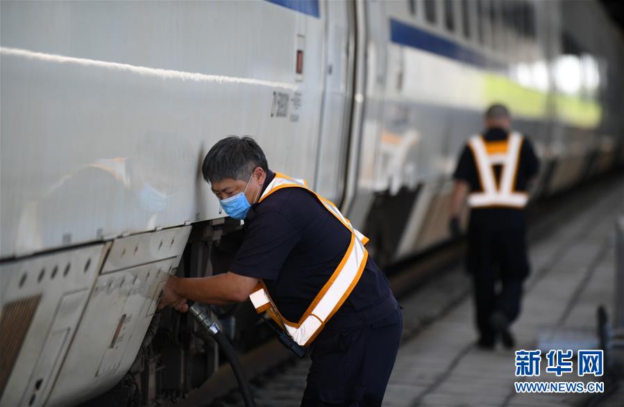 8月12日,長春火車站客運車間上水工王軍在給列車上水。進入暑運高峰,為了保障列車正常用水,每當一列火車??寇囌荆L春火車站的上水工就冒著酷暑將水管插進火車底部的輸水口,快速準確完成輸水作業(yè)。新華社記者 林宏 攝