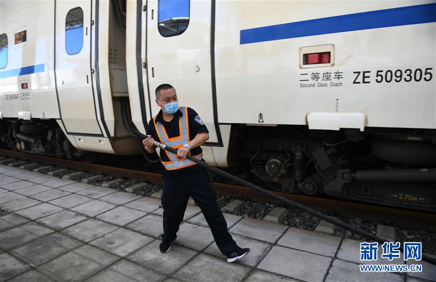 8月12日,長春火車站客運車間上水工常明為剛剛到站的一趟列車上水。新華社記者 林宏 攝