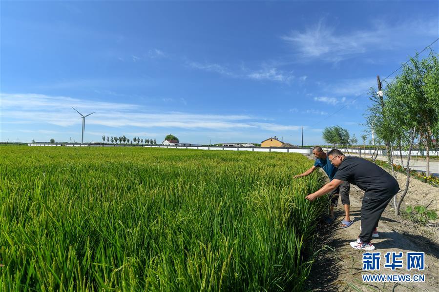 8月12日,在鎮(zhèn)賚縣黑魚泡鎮(zhèn)岔臺(tái)村,村民曲海波(左)和駐村第一書記姜宏寅在查看水稻長勢(shì)。新華社記者 張楠 攝