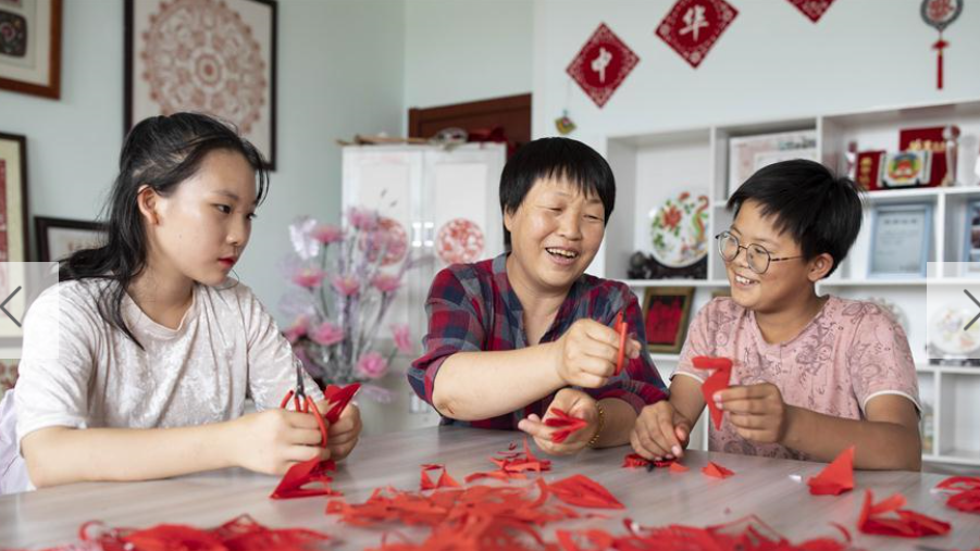 8月2日,寧夏吳忠市利通區(qū)永昌社區(qū)手工培育坊內,自治區(qū)級剪紙非遺傳承人趙文花(中)在教小學生剪紙。