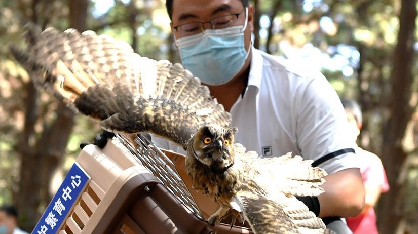 7月1日,吉林省野生動物救護繁育中心工作人員放飛一只長耳鸮。當日,吉林省東北虎園舉行放飛活動,吉林省野生動物救護繁育中心救護的40只珍稀野生鳥類成功放歸自然。