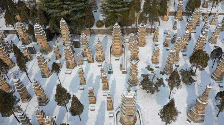 1月10日無(wú)人機(jī)拍攝的少林寺一景。當(dāng)日,雪后初霽,河南登封少林寺分外秀美。