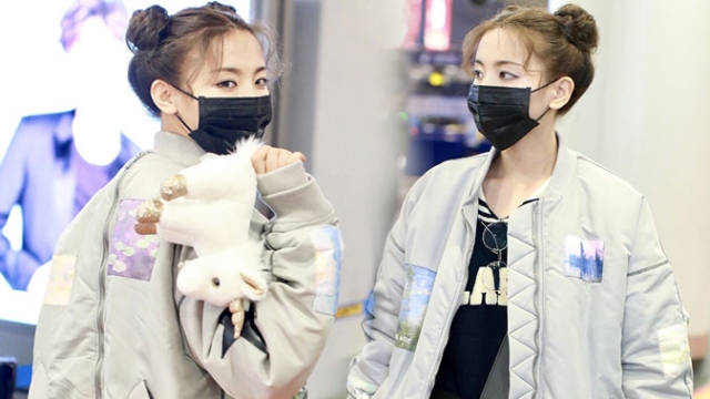 2019年1月14日,北京,楊超越現(xiàn)身機場。她扎哪吒頭活力十足,甩玩偶淘氣回眸,穿破洞褲露美腿,披面包服似自帶鼓風機。