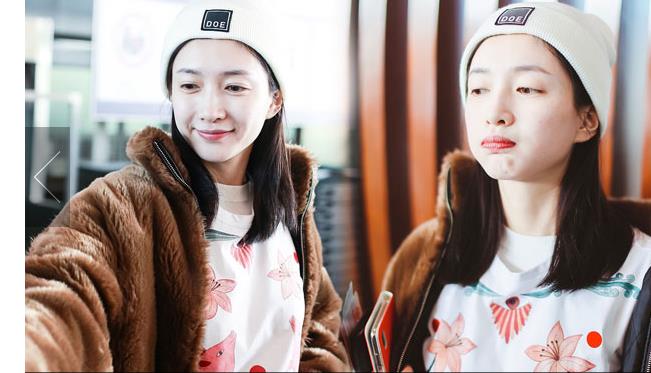 1月23日,北京,周冬雨現(xiàn)身機場。她用黑色連衣帽罩頭襯托巴掌臉,把下巴擱在行李車推桿上的雙手上呆萌可愛 。