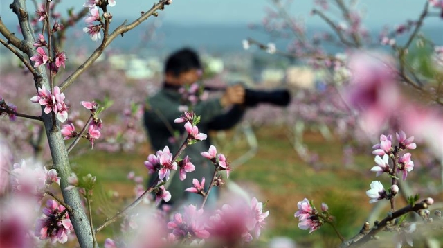 春季里,云南省曲靖市沾益區(qū)鄉(xiāng)村果園里的桃花梨花競相綻放,景色秀美,吸引游人前來觀光。