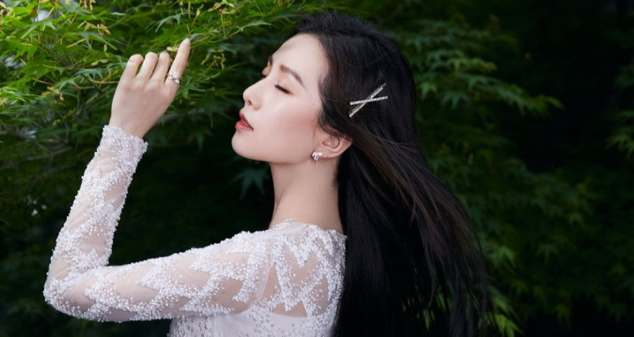 她穿著白色蕾絲長裙化身小仙女,黑色長發(fā)披肩,搭配可愛的小夾子,溫柔大方氣質(zhì)清新。