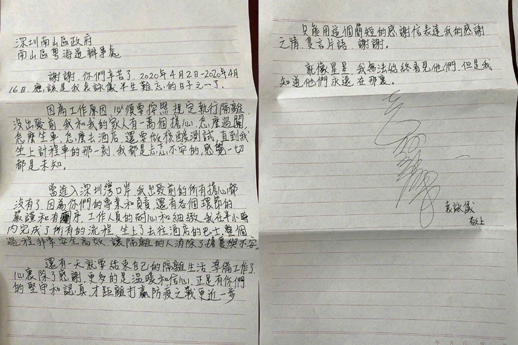 袁詠儀在深隔離14天“畢業(yè)” ,手寫信贊深圳高效暖心!