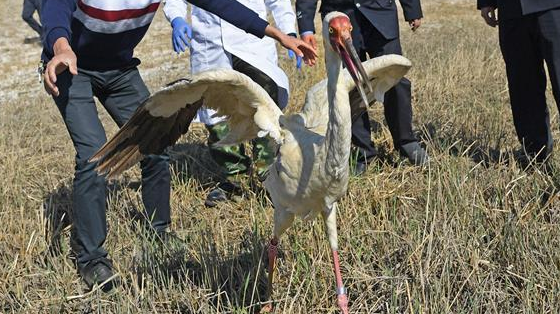 當(dāng)日,在吉林省莫莫格國家級自然保護區(qū),江西省野生動植物救護繁育中心工作人員將一只在江西鄱陽湖區(qū)“落單”的小白鶴放飛野外。