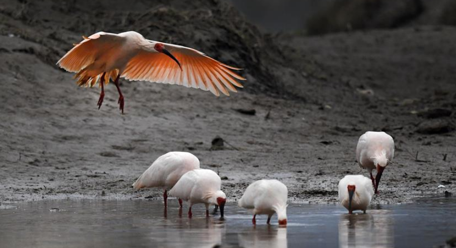 每年冬季,成群結(jié)隊的朱鹮飛翔在漢江及漢江支流的河灘、濕地,覓食、棲息,成為當(dāng)?shù)匾坏懒聋惖娘L(fēng)景線。?