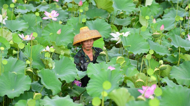 6月10日在江蘇大豐麋鹿國(guó)家級(jí)自然保護(hù)區(qū),麋鹿在水塘覓食。