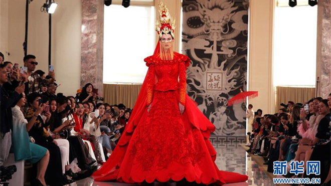 9月30日,在法國巴黎,模特展示中國高級女裝品牌“蓋婭傳說·熊英”2020春夏新品。