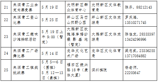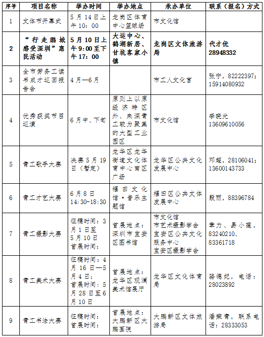活動(dòng)期間,全市將舉辦25項(xiàng)全市性重要活動(dòng),分為6項(xiàng)活動(dòng),19項(xiàng)比賽。其中,6項(xiàng)活動(dòng)為開幕式、“行走鵬城 感受深圳”惠民活動(dòng)、全市勞務(wù)工讀書成才巡回報(bào)告會(huì)、來深青工文體節(jié)回顧圖片展、閉幕式及優(yōu)秀獲獎(jiǎng)節(jié)目展演;19項(xiàng)比賽活動(dòng)分別是來深青工歌手大賽(全國)、才藝大賽、攝影大賽(全國)、美術(shù)大賽、書法大賽、知識(shí)競(jìng)賽、演講比賽、打工文學(xué)大賽(全國)、羽毛球混合團(tuán)體賽、跳繩比賽、乒乓球競(jìng)賽、趣味體育比賽、拔河比賽、三人籃球賽、業(yè)余定向賽競(jìng)賽、登山比賽、棋類挑戰(zhàn)賽、趣味沙灘排球比賽、廣場(chǎng)健身操比賽。參賽對(duì)象主要為在深工作的18至50歲非深戶籍人士(不包括在各類文化演藝公司、培訓(xùn)機(jī)構(gòu)中從事文藝表演、培訓(xùn)的專業(yè)人員)。
