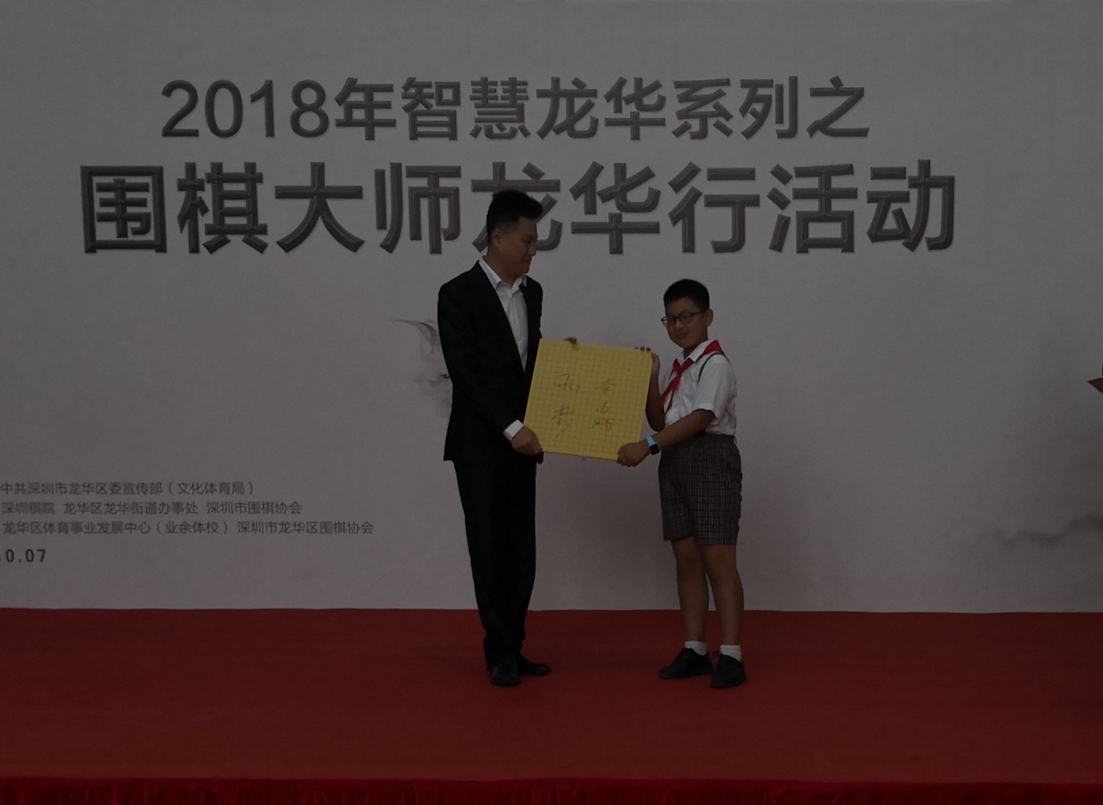 開幕式上,龍華區(qū)委副書記苗寧禮,龍華區(qū)委常委、宣傳部長黃啟鍵及區(qū)文化體育局相關(guān)負(fù)責(zé)人等在百忙中前來為“智慧龍華”捧場加油?;顒釉谳p松熱鬧的歌舞中拉開帷幕,文化體育局負(fù)責(zé)人在致辭中對諸位圍棋大師的到來表示熱烈的歡迎,對活動擴(kuò)大中華圍棋文化的傳播,推動龍華區(qū)圍棋的發(fā)展給予了充分的肯定。隨后,黃啟健常委代表龍華區(qū)聘請李昌鎬大師擔(dān)任龍華區(qū)圍棋發(fā)展的名譽(yù)顧問并頒發(fā)了證書,李昌鎬則回贈了簽名棋盤。緊接著,孔杰老師也給參加活動的小棋手贈予了簽名棋盤。在廣東圍棋總冠軍佟云老師簡要介紹李昌鎬、孔杰的精采圍棋經(jīng)歷之后,活動主持人還現(xiàn)場采訪了李昌鎬、孔杰,就兩人圍棋從業(yè)過程中的難記經(jīng)歷、精采賽事以及對人工智能圍的展望等進(jìn)行了提問,兩位大師的回答坦率、誠懇,贏得了現(xiàn)場觀眾的陣陣掌聲?;顒拥母叱笔抢畈€、孔杰、車澤武、張亞博四位老師與龍華區(qū)的圍棋愛好者進(jìn)行多面打的活動,梁偉棠九段和徐瑩老師還進(jìn)行掛盤講解。