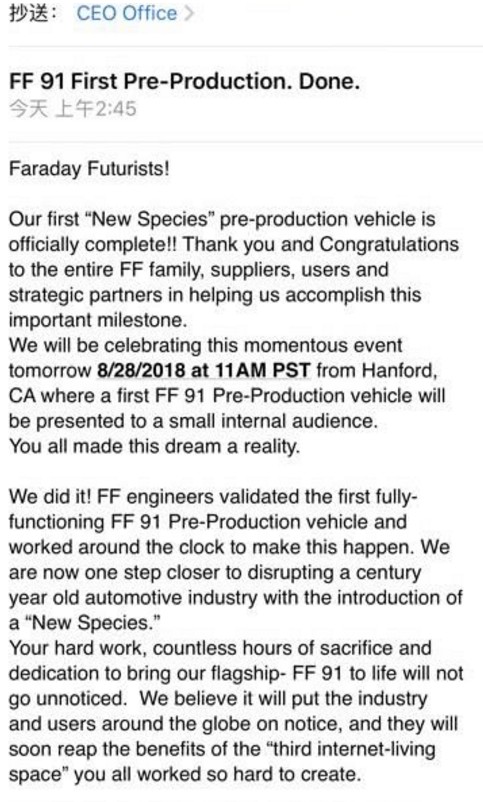 智通財(cái)經(jīng)APP獲悉,當(dāng)?shù)貢r(shí)間27日凌晨,賈躍亭創(chuàng)辦的美國(guó)電動(dòng)汽車品牌FF(Faraday Future)的員工收到來(lái)自CEO辦公室郵件,稱FF91的第一輛試產(chǎn)車已經(jīng)完成。