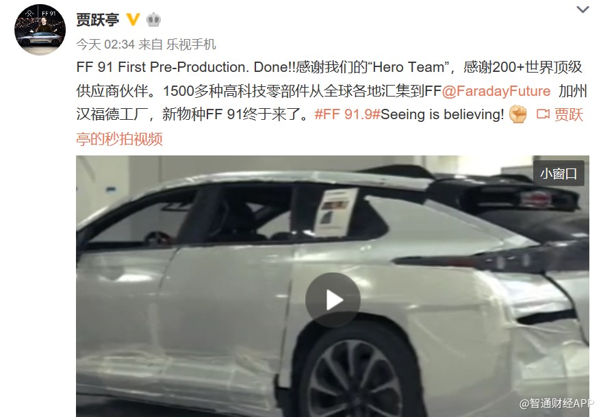 他在微博中寫道“感謝FF的‘Hero Team’,感謝200+世界頂級供應商伙伴,1500多種高科技零部件從全球各地匯集到FF加州漢福德工廠,新物種FF91終于來了。”