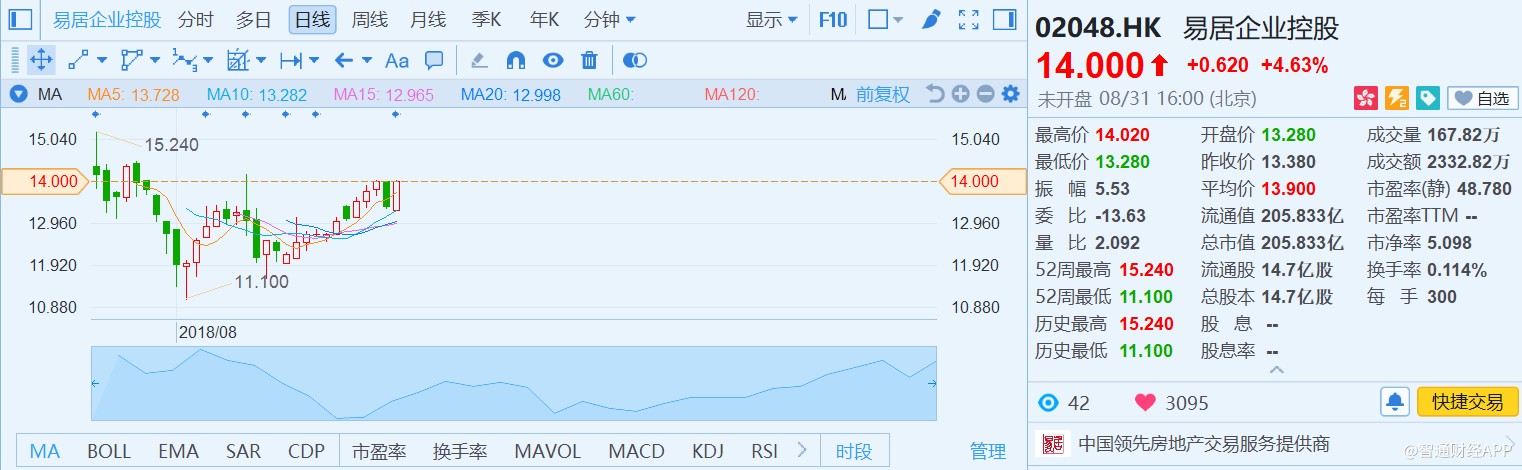 中國房地產(chǎn)行業(yè)正站在拐點(diǎn)上,行業(yè)集中度將進(jìn)一步提升,存量市場成為各路資本的新戰(zhàn)場,“服務(wù)生”易居在資源及戰(zhàn)略布局上已做好充分準(zhǔn)備,上半年的成績或許只是新的起點(diǎn)。8月31日,易居股價(jià)收漲4.63%,報(bào)14港元。