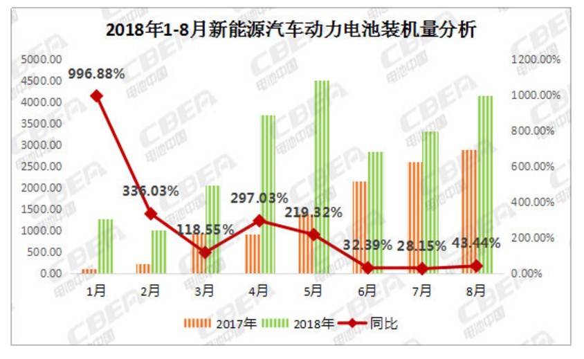 智通財經(jīng)APP獲悉,據(jù)動力電池應(yīng)用分會研究部分析數(shù)據(jù)顯示,2018年8月,我國新能源汽車動力電池裝機(jī)量約4.17Gwh,環(huán)比增長25%,同比增長43.44%;1-8月累計裝機(jī)總量約22.97Gwh。