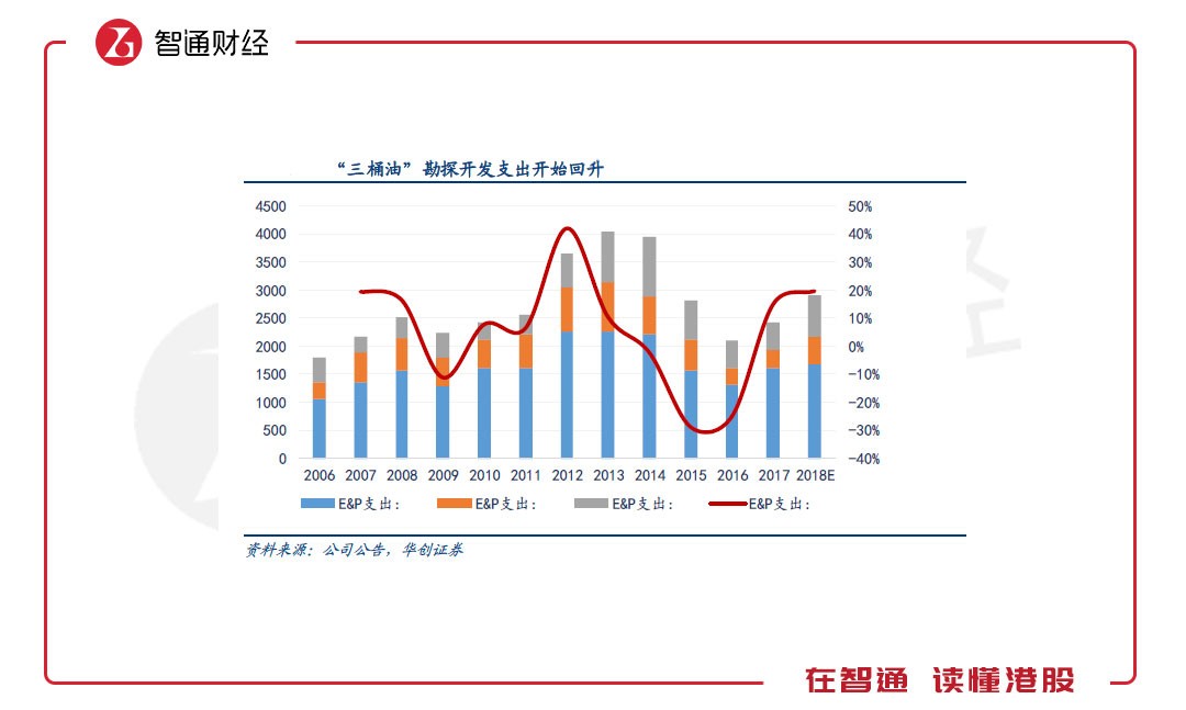 截至2018年,“三桶油”公告用于勘探、開發(fā)的資本支出回升至2911億元,相對2016年已實現(xiàn)38%增長,但仍舊遠低于行業(yè)高點水平,有巨大上升空間。