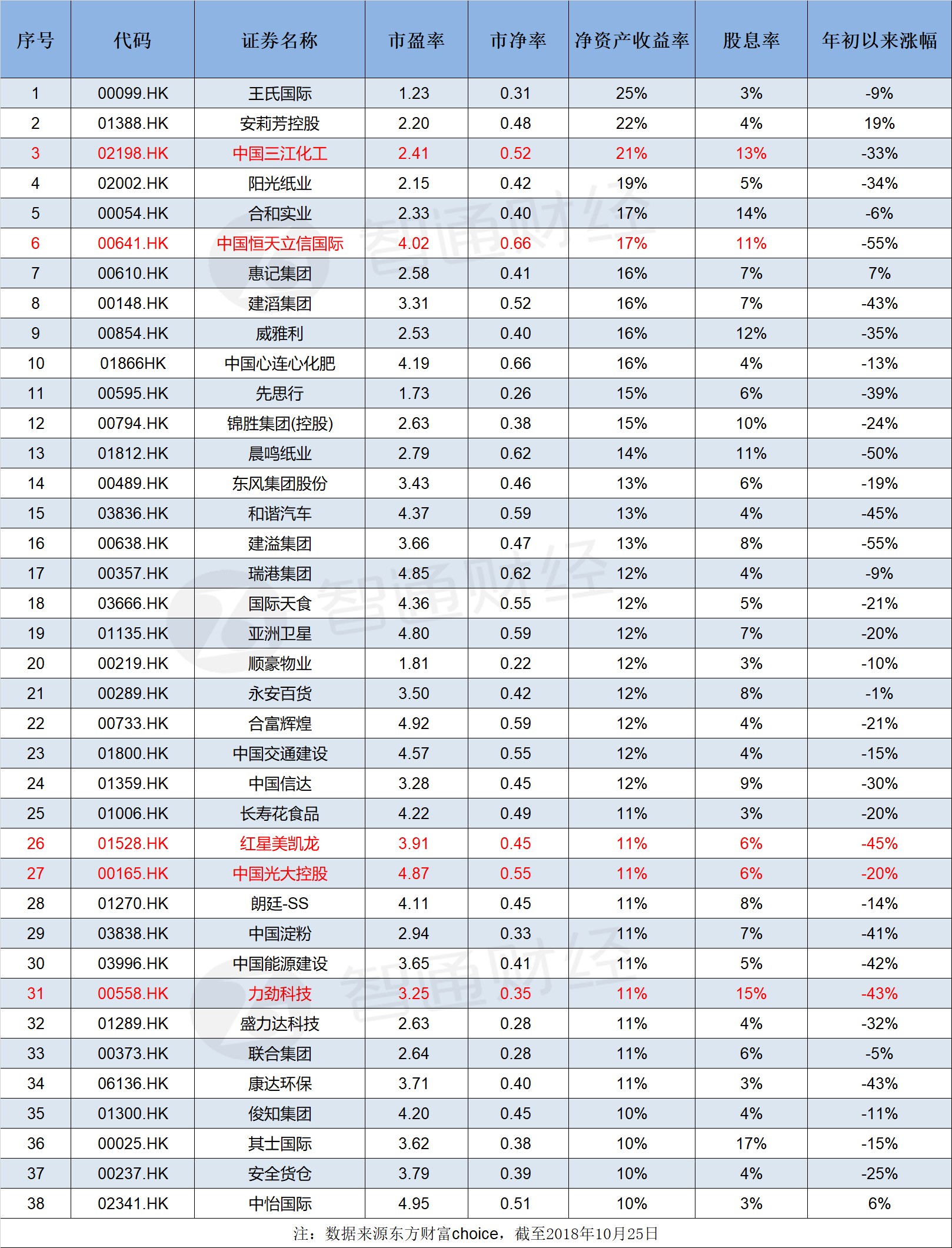 圖表顯示,截止2018年10月25日,從ROE指標(biāo)來(lái)看,指標(biāo)比較居前的公司有安莉芳(01388)、中國(guó)三江化工(02198)、合和實(shí)業(yè)(00054)。其中,中國(guó)三江化工為ROE及股息率雙高個(gè)股。