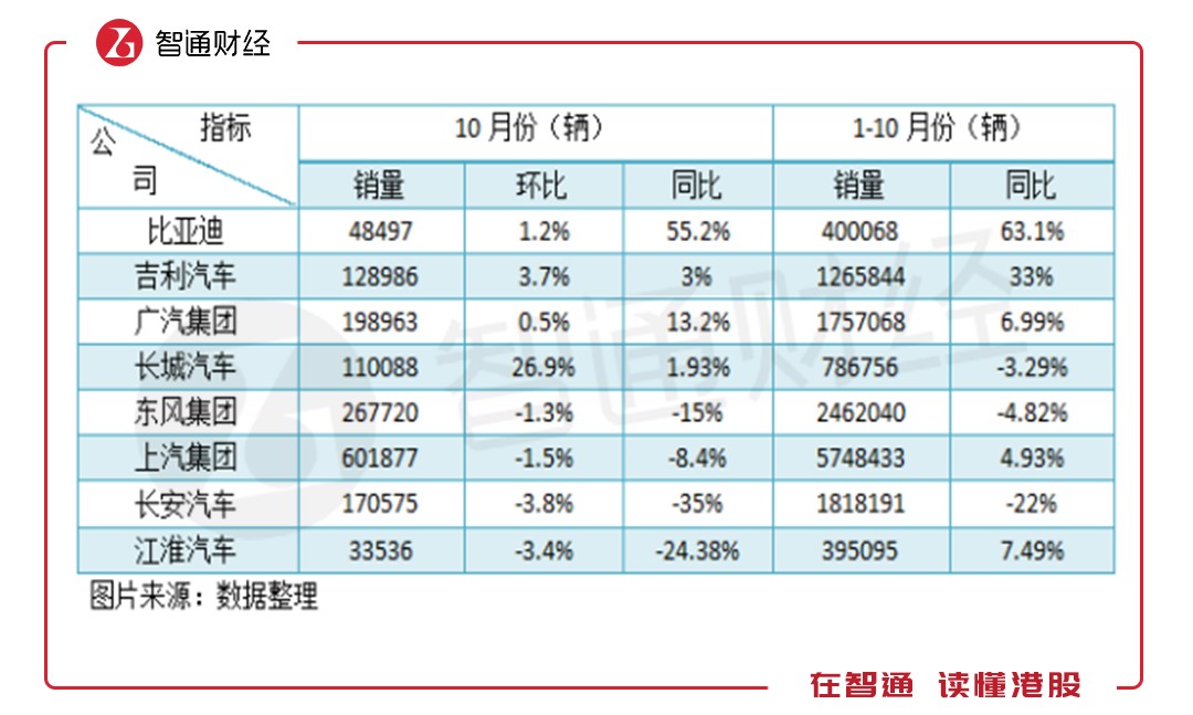 目前大部分車企基本都公布了10月份及首10個(gè)月的汽車銷量情況,智通財(cái)經(jīng)APP將這些公布銷量的車企整理如下表: