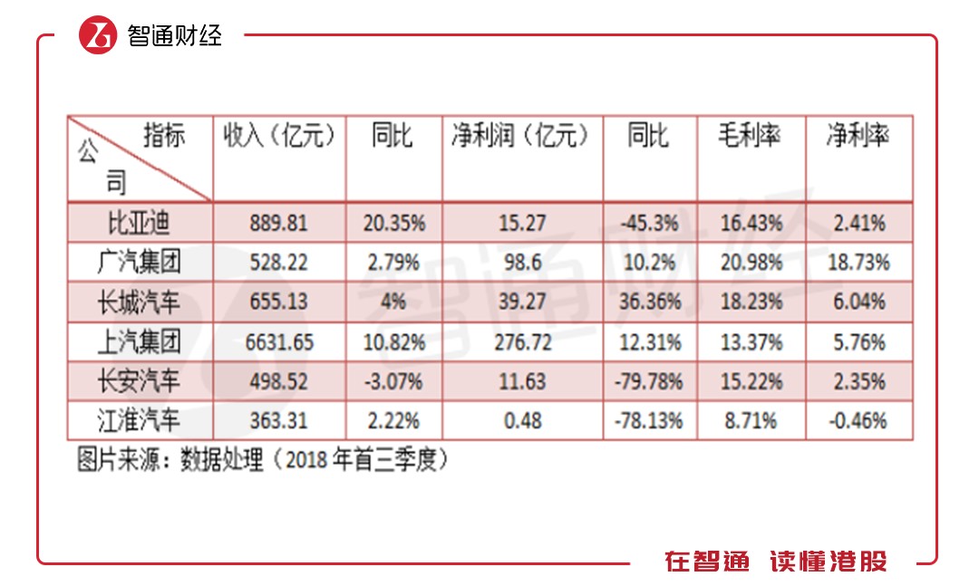 從抽樣的標(biāo)的看,2018年首三季度比亞迪(01211)的收入增速是最快的,其次是上汽集團(tuán),其余標(biāo)的增速單位數(shù)甚至是負(fù)增長,在此次標(biāo)的中,沒有自主品牌龍頭吉利汽車(00175),不過以該公司上半年的收入增速看,和比亞迪是同一個(gè)高增長賽道。在盈利上,各個(gè)車企差異還是挺大的,不過,在這塊操作靈活性較大。