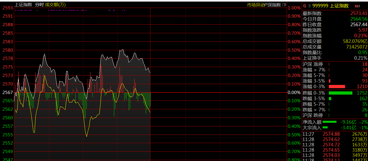 云財經(jīng)訊,截至早盤收盤,上證指數(shù)報2573點,漲0.23%;深證成指報7602點,漲0.08%;創(chuàng)業(yè)板指數(shù)報1312點,跌0.01%。盤面上,白酒、分散染料、鋰電池等板塊漲幅居前,天津自貿(mào)區(qū)、知識產(chǎn)權保護、高送轉等板塊跌幅居前。