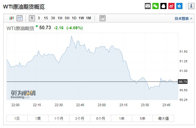 截至發(fā)稿,WTI原油跌4.08%報50.73美元/桶。