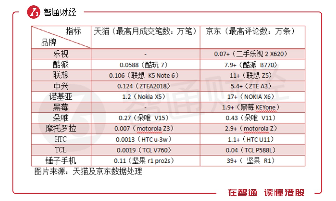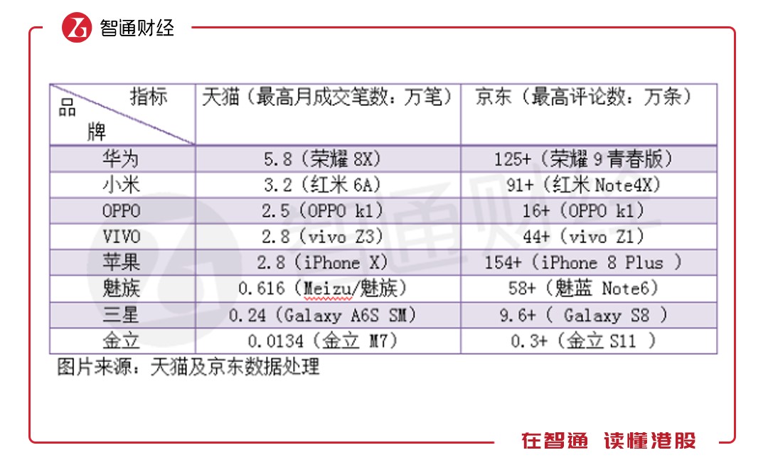 電商的崛起讓手機(jī)多了一條網(wǎng)絡(luò)強(qiáng)大的銷售渠道,目前天貓和京東是電商平臺(tái)中的兩大巨頭,國(guó)內(nèi)的最終商品基本在這兩大平臺(tái)售賣。智通財(cái)經(jīng)APP通過天貓及京東相對(duì)應(yīng)的月成交筆數(shù)及評(píng)論數(shù)了解不同品牌的智能手機(jī)售賣情況。