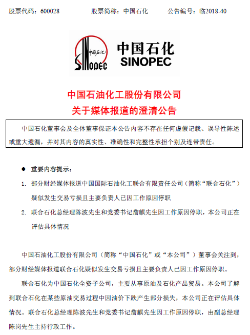 智通財(cái)經(jīng)APP獲悉,中國石化今日(12月27日)晚間在上交所發(fā)表公告稱,了解到聯(lián)合石化在某些原油交易過程中因油價(jià)下跌產(chǎn)生部分損失,公司正在評估具體情況。聯(lián)合石化總經(jīng)理陳波先生和黨委書記詹麒因工作原因停職,由副總經(jīng)理陳崗主持行政工作。此外,中國石化還表示,目前公司生產(chǎn)經(jīng)營情況一切正常。(林雅蕓)