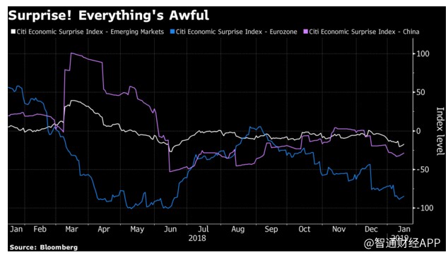 兩位分析師表示,歐洲和新興市場(chǎng)的經(jīng)濟(jì)驚喜指數(shù)均陷入負(fù)值區(qū)間。而標(biāo)普500指數(shù)成份股公司約有三分之一的營(yíng)收來自海外,海外市場(chǎng)的進(jìn)一步疲軟可能最終會(huì)令美國(guó)國(guó)內(nèi)的增長(zhǎng)前景變得黯淡。此外,美國(guó)國(guó)內(nèi)的經(jīng)濟(jì)增長(zhǎng)前景在一定程度上也已經(jīng)因美國(guó)政府部分關(guān)門而減弱。