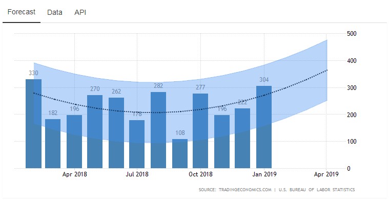 根據(jù)Trading Economics的預(yù)測(cè),2月非農(nóng)數(shù)據(jù)將會(huì)延續(xù)1月的勢(shì)頭,呈現(xiàn)上行趨勢(shì)。