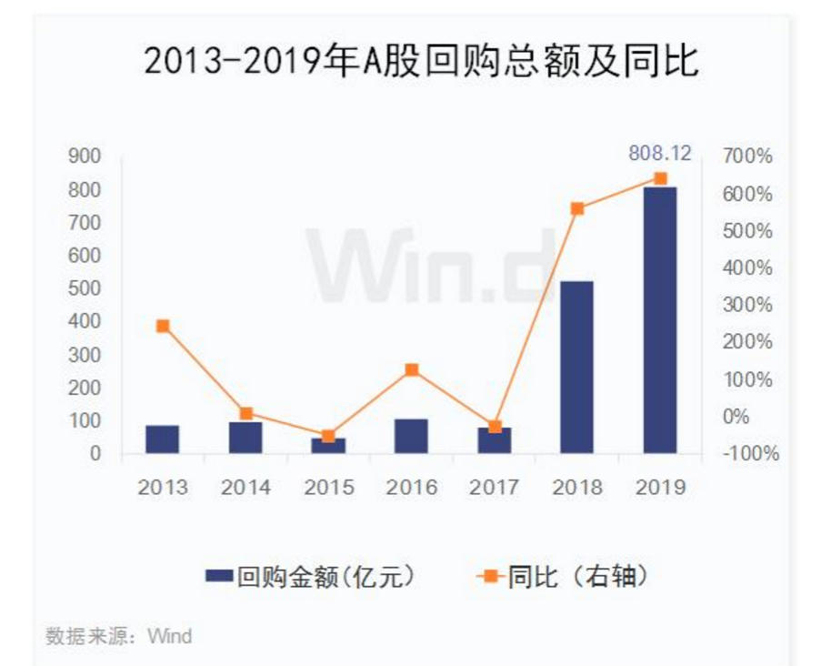 2019年初至今,兩市已有711家公司實施了回購計劃,總回購金額遠(yuǎn)超去年全年,達(dá)808.12億元,同比增長6.43倍,2018年同期回購總規(guī)模為108.76億元。