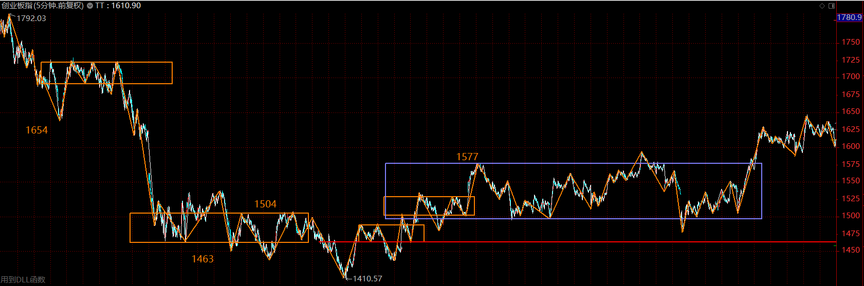 創(chuàng)業(yè)板指數(shù)依舊強(qiáng)勢,這里在構(gòu)建30分鐘級別的三買,以1577點(diǎn)為界,如果回調(diào)不破,則這里將是創(chuàng)業(yè)板主升行情的起點(diǎn)。如若重新跌回中樞內(nèi)部,則按中樞震蕩處理。創(chuàng)業(yè)板走勢要強(qiáng)于主板很多,后續(xù)行情多半仍然圍繞創(chuàng)業(yè)板展開。