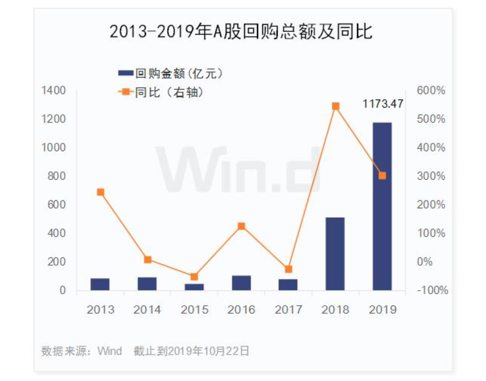 2、A股回購(gòu)數(shù)量和金額呈爆發(fā)式增長(zhǎng):截止10月22日,2019年兩市已有974家公司實(shí)施了1397筆回購(gòu),總回購(gòu)金額已達(dá)1173.47億元,較去年同期增幅超過(guò)3倍。