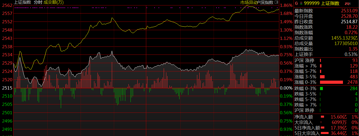 今天漲停家數(shù)較上一交易日增加,兩市93家漲停,跌停0家。成交量方面,滬市成交1455億元,深市成交2018億元,兩市總成交額約為3473元,較上一交易日放量250億元。