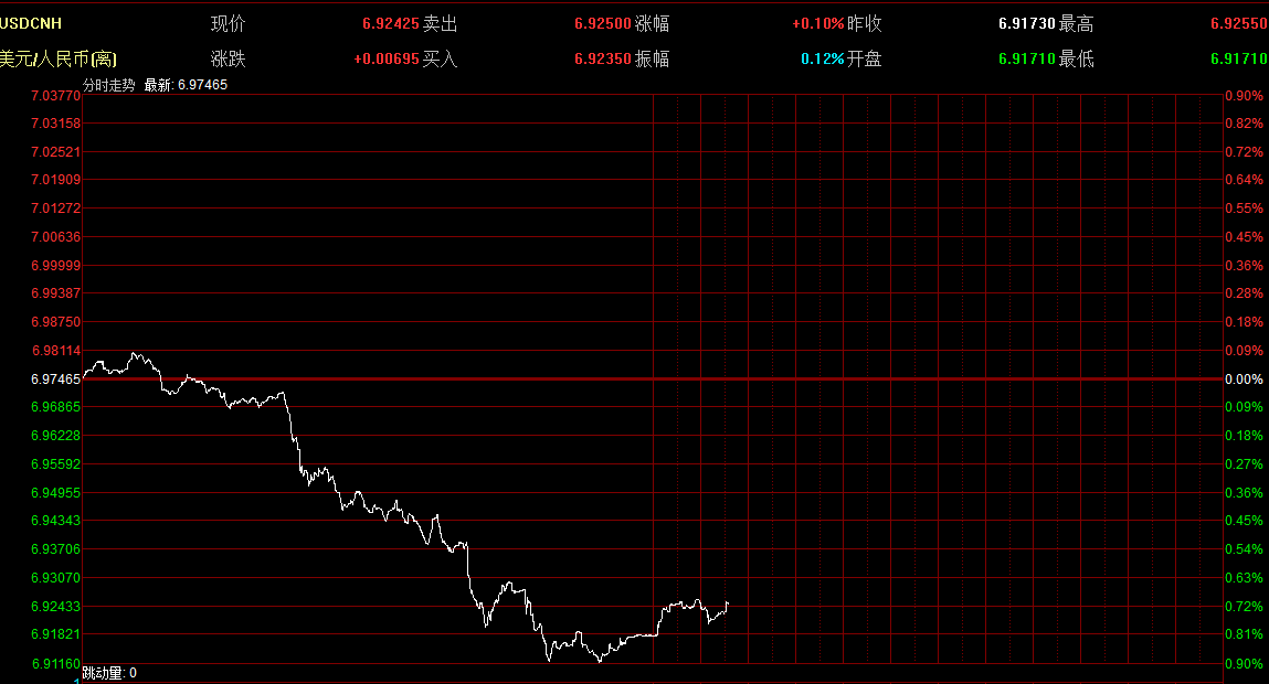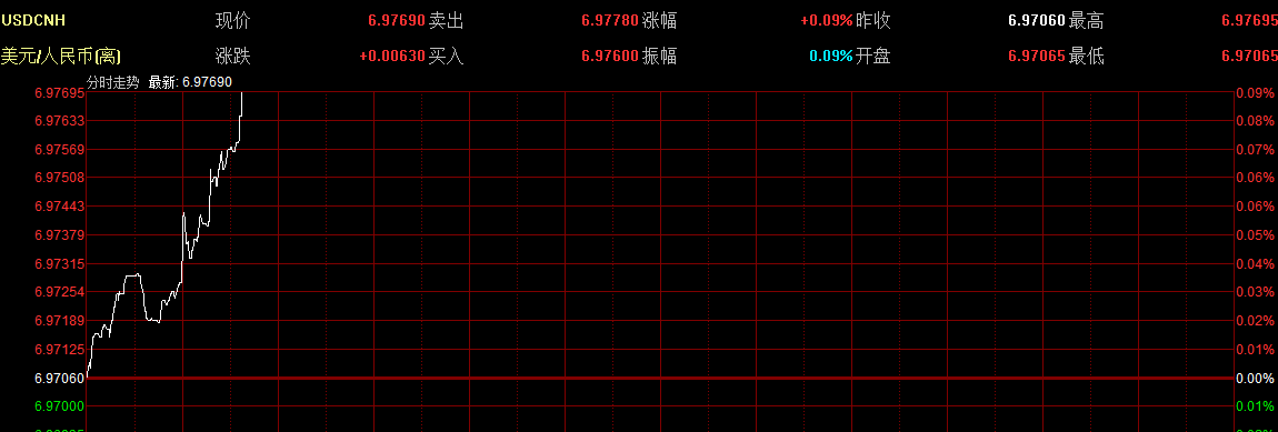 10月30日,離岸人民幣兌美元匯率再度跌破6.97關(guān)口,盤中觸及6.9773低點(diǎn),創(chuàng)10年來新低。截至19時(shí)15分報(bào)6.9732,貶值16基點(diǎn):在岸人民幣即期匯率報(bào)6.9639,貶值17基點(diǎn)。