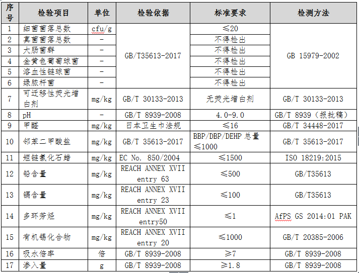 安全性能指標包括微生物、甲醛、pH、可遷移性熒光增白劑、化學物質(zhì)等五個方面。